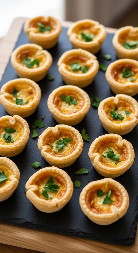 Savory tarts are essential for balancing out the sweets. Small, individual quiches with spinach, feta, or bacon are easy to grab and eat while standing. The golden-brown crusts and colorful fillings look wonderful when arranged on a tiered slate stand.