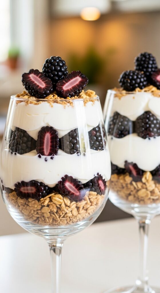 Serve yogurt, granola, and honey in elegant wine glasses. The layers of white yogurt and dark berries look sophisticated and clean. It’s a mess-free way to serve a healthy option. Plus, using stemware for yogurt makes the meal feel more formal and “special occasion” worthy.