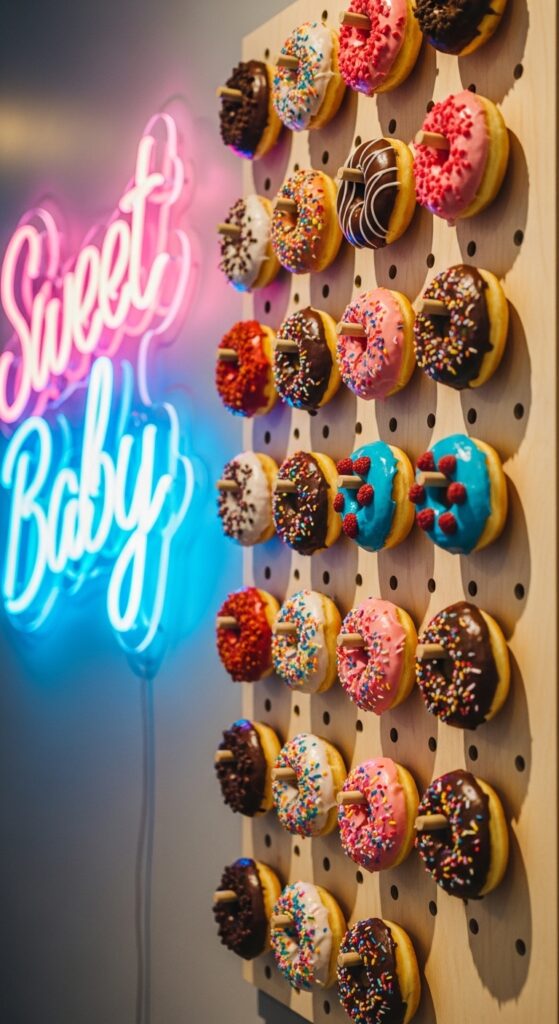 A donut wall is both a decoration and a dessert. Hang glazed, powdered, and sprinkled donuts on a pegboard. It’s an instant conversation starter and a massive hit for Pinterest-style photography. This works especially well if you have a tiny bar ideas for cozy spaces area that you can repurpose into a dessert corner.