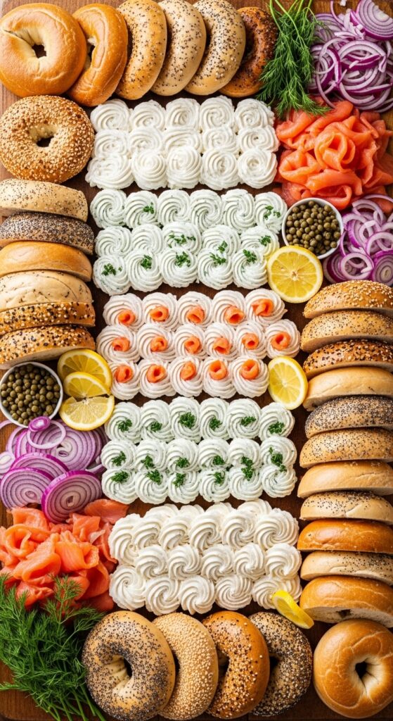 Move over charcuterie; the bagel board is here. Arrange various bagel halves with different cream cheese flavors, smoked salmon, capers, and sliced red onions. It’s a savory delight that fills people up. The key to the visual appeal is the “organized chaos” of the arrangement—layering the ingredients so it looks like a feast of plenty.