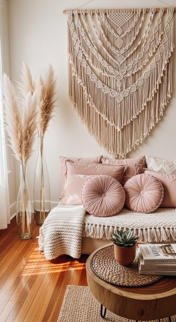 Think pampas grass, macrame runners, and soft pastel textiles. This aesthetic is a Pinterest staple because it feels warm and lived-in. If your brunch is being held in a multi-purpose area, consider how upstairs loft ideas can help you create a cozy, intimate lounge space for opening gifts. Use floor pillows to keep the seating relaxed.