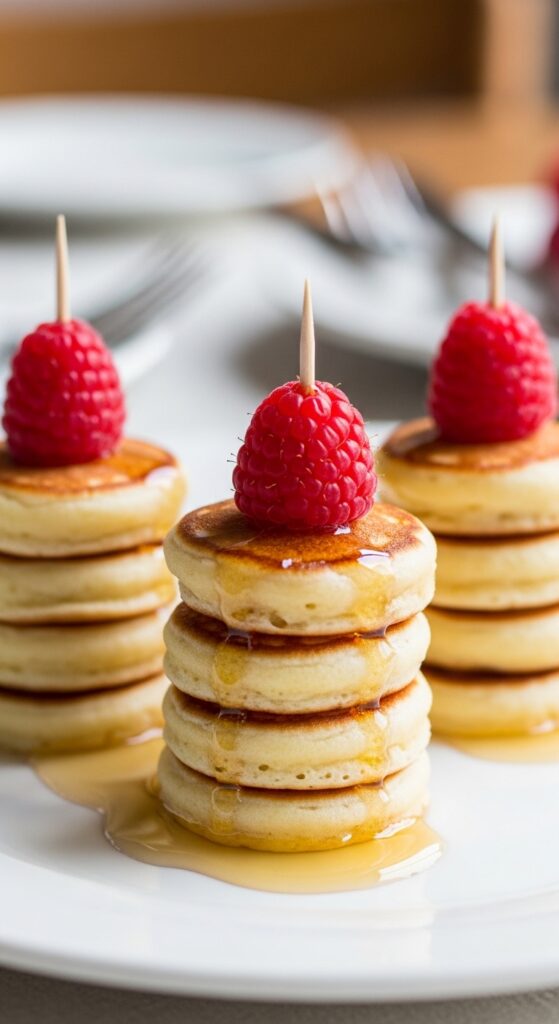 Tiny food is always a hit at baby showers. Serve bite-sized pancake stacks held together with a wooden skewer and topped with a single raspberry. Drizzle a tiny bit of syrup just before serving. These are perfect for “mingle-friendly” eating and look adorable in photos. They embody the “little one” theme perfectly through their scale.