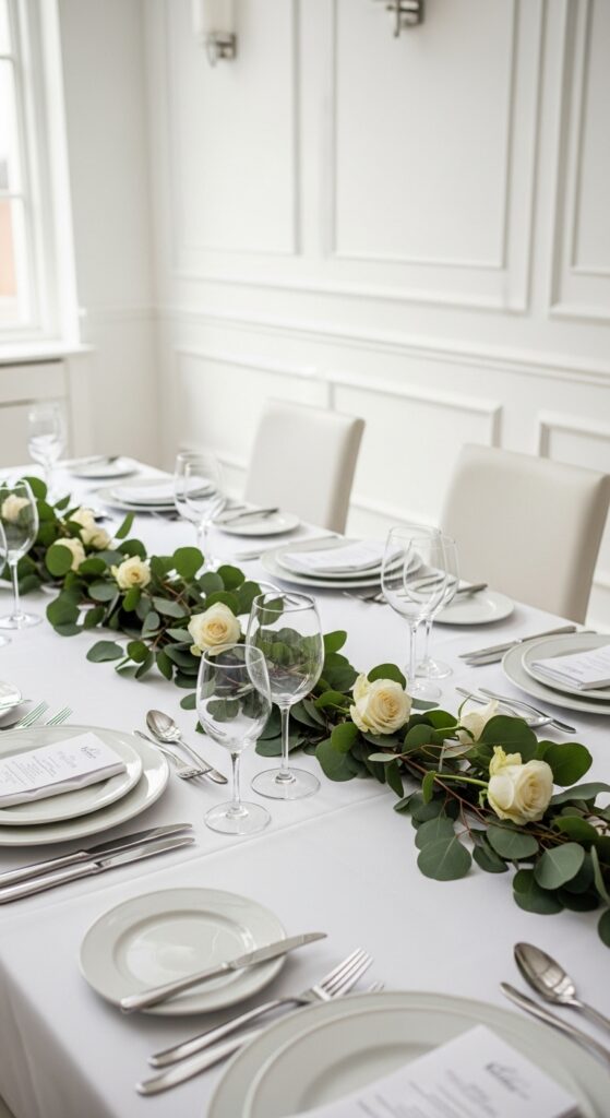 Bring the outdoors in by using lush greenery and white florals. This theme works beautifully if you are looking for 16 wall molding ideas to serve as a sophisticated backdrop for your food table. Focus on eucalyptus runners and potted herbs. It creates a serene, fresh environment that feels high-end yet earthy.