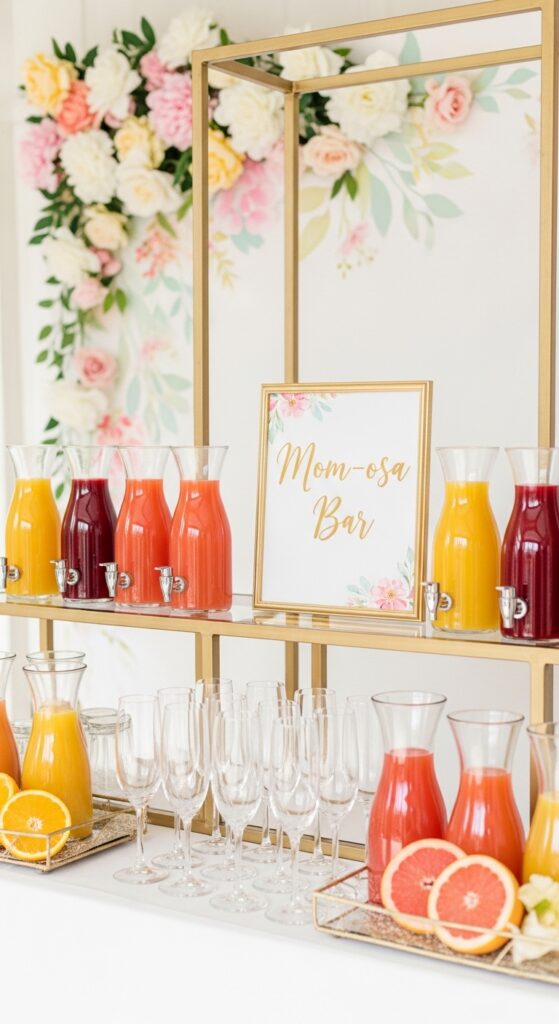Every brunch needs a signature drink station. Create a “Mom-osa” bar featuring various fruit juices like orange, cranberry, and peach, topped with sparkling cider or ginger ale for a non-alcoholic treat. Use elegant champagne flutes and garnish with sprigs of rosemary or fresh raspberries. This setup looks incredibly chic and keeps the vibe celebratory yet inclusive for the expectant mom.