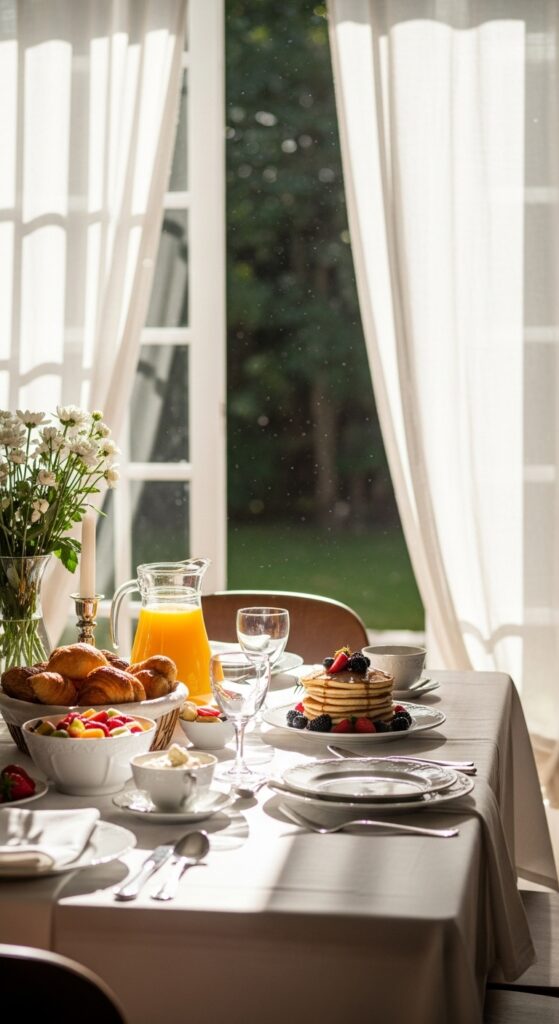 Brunch is all about the light. If you have large windows, use sliding glass door covering options like sheer linens to let the soft glow in while maintaining privacy. The soft, filtered light will make your food photography look professional.