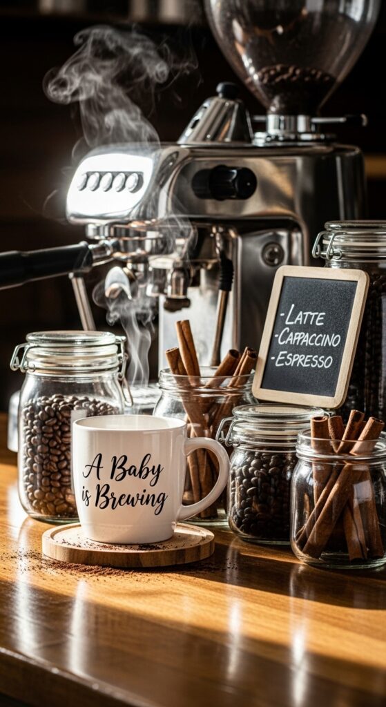 Set up a professional-style coffee station with syrups, oat milk, and cinnamon. Provide custom cardboard sleeves that say “A Baby is Brewing.” This is a cozy addition, especially for fall or winter showers, and provides a lovely aroma throughout the house.