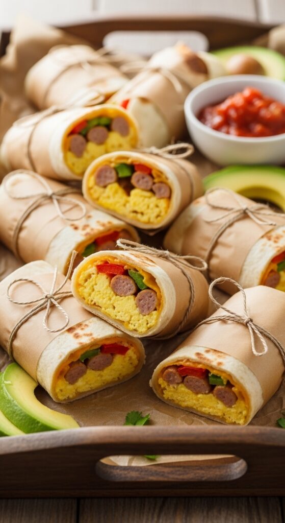 For a hearty option, serve mini breakfast burritos wrapped in parchment paper and tied with twine. This “rustic-chic” presentation keeps the food warm and makes it easy for guests to handle without needing a full set of cutlery.