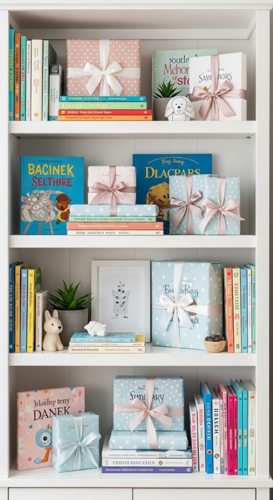 Instead of a cluttered table, use a styled bookshelf to hold gifts or party favors. You can find inspiration from 17 brilliant bookshelf styling ideas with lots of books to make the gift area look like a curated art piece. It keeps the room tidy and photo-ready.
