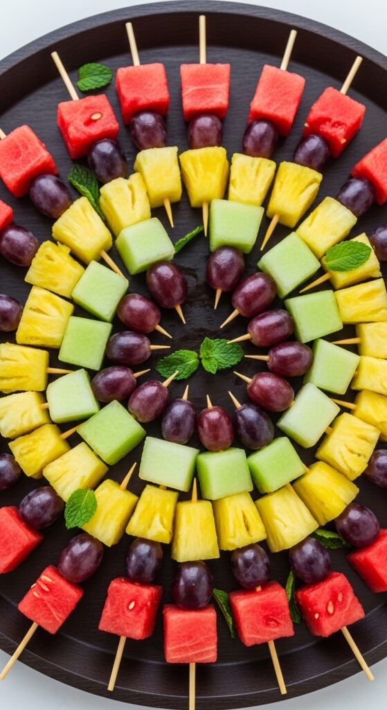 Thread melons, grapes, and pineapple onto skewers and finish with a fresh mint leaf. It’s a refreshing palate cleanser. Arrange them in a starburst pattern on a round tray for maximum visual impact. The bright colors are a natural mood booster for the room.
