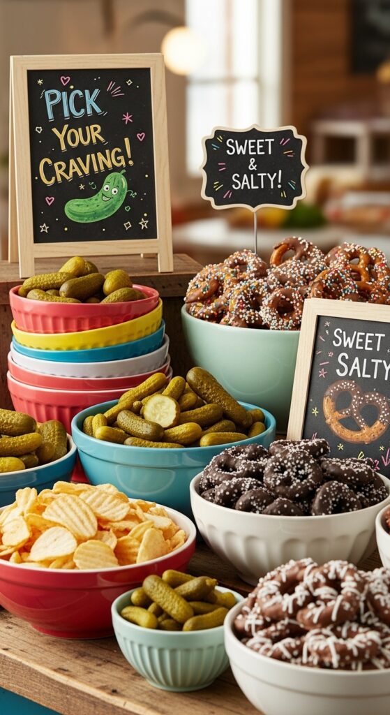 Create a fun station featuring the specific foods the mom-to-be has been craving during pregnancy—whether it’s pickles, spicy chips, or chocolate-covered pretzels. Label them with cute signs. It’s a humorous and touching way to center the party around her unique journey.