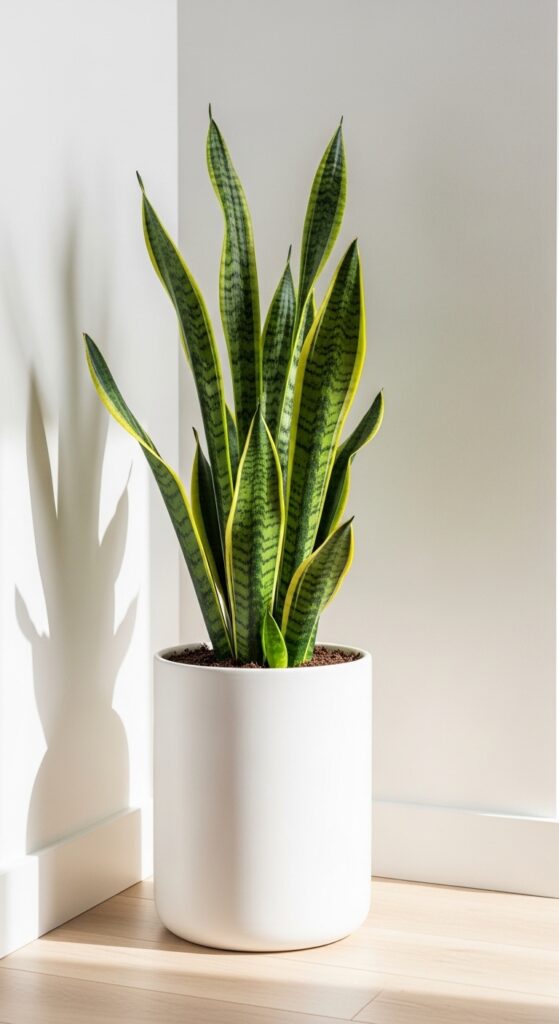 The Snake Plant is the king of minimalism. Its vertical, sword-like leaves create a striking silhouette against a white backdrop. In a smooth, white ceramic pot, it acts like a piece of living sculpture. It’s incredibly low-maintenance, thriving on neglect and low light. For a Pinterest-style look, place a tall variety in a floor-standing white planter next to your TV stand. The contrast between the dark green yellow-edged leaves and the bright white pot is stunning and clean.