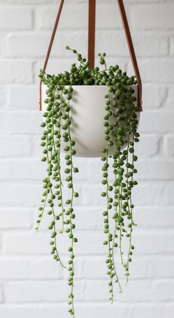 Not every plant needs to be on the floor. A String of Pearls cascading down the side of a white hanging planter is the definition of “shelfie” goals. The tiny, pea-like beads create a vertical line of green that draws the eye upward. Use a matte white hanging pot with a simple leather cord to keep the look organic. It’s perfect for bookshelf styling or hanging near a window.