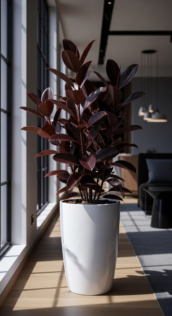 Specifically, the ‘Burgundy’ or ‘Tineke’ varieties look incredible in white. The Burgundy has dark, moody leaves that provide a sharp, dramatic contrast to a bright white ceramic pot. If you prefer the ‘Tineke’, its variegated white and green leaves harmonize with the planter for a soft, blended look. This plant is a statement piece; one large Rubber Tree in a corner is often all the decor a minimalist room needs.