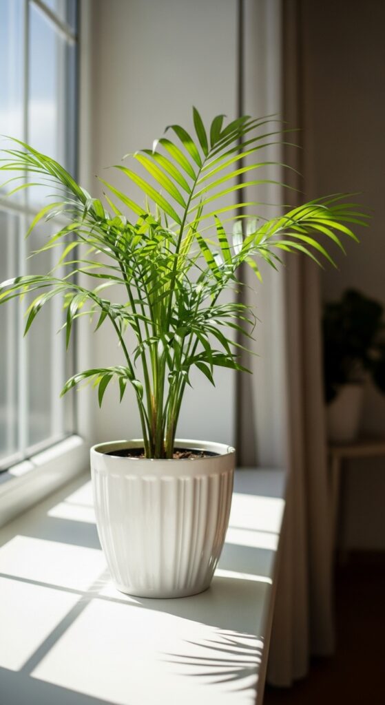 For those who find minimalism a bit too “stark,” the Parlor Palm adds a soft, feathery texture. When paired with a white fluted planter, it bridges the gap between classic and modern. The fine fronds catch the light beautifully. Imagine this sitting on a sun-drenched windowsill; the white pot reflects the morning sun, while the palm leaves filter it, creating beautiful dancing shadows on your floor.