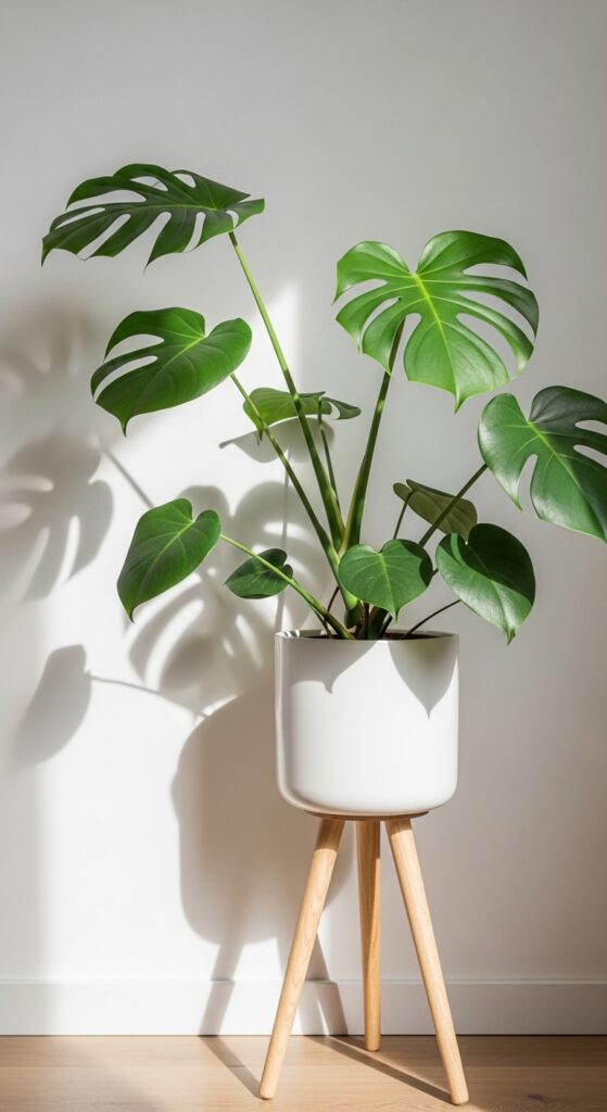 A favorite for a reason—the Swiss Cheese Plant brings a tropical yet high-fashion vibe. Because the leaves are so large and detailed, a simple, untextured white planter is necessary to keep it from looking “too much.” Place a medium-sized Monstera on a wooden plant stand with a white pot to add a bit of warmth. The shadows cast by the leaf holes against a white wall create a dynamic visual interest that bloggers love.