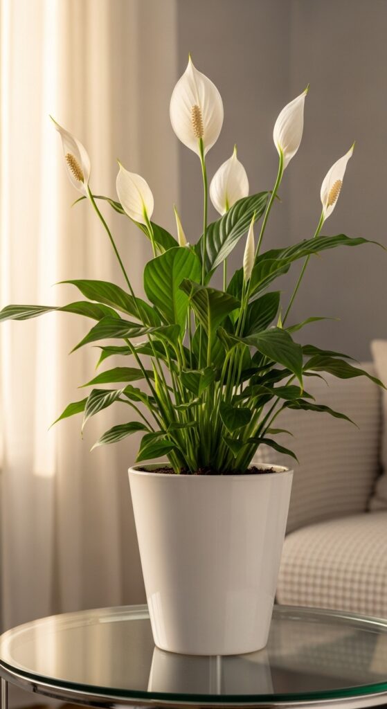 If you want a touch of softness, the Peace Lily is your go-to. Its deep green, glossy leaves draped over a white tapered planter create a sophisticated look. When it blooms, the white spathes match the planter perfectly, creating a monochromatic theme. It’s perfect for a side table. It tells a story of purity and calm, making it a favorite for those who want their living room to feel like a high-end spa retreat.