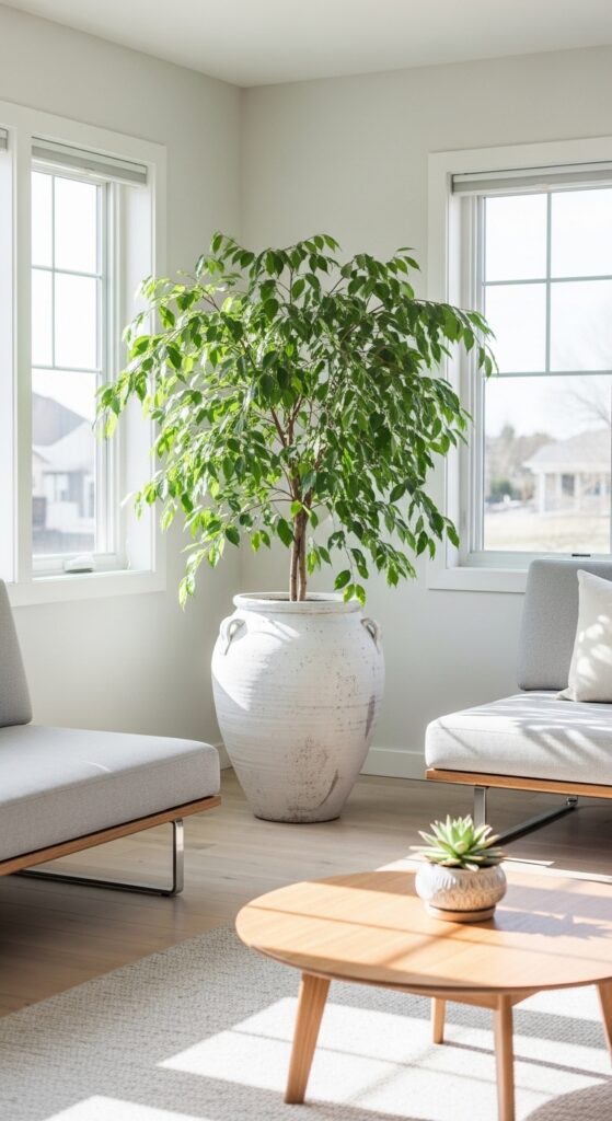 The Weeping Fig offers a more traditional “tree” look but remains minimalist when the trunk is kept clean and the pot is a simple white stone texture. It’s perfect for adding a bit of “English Garden” soul to a modern white apartment. The tiny leaves create a dense canopy that looks beautiful against a plain white wall.