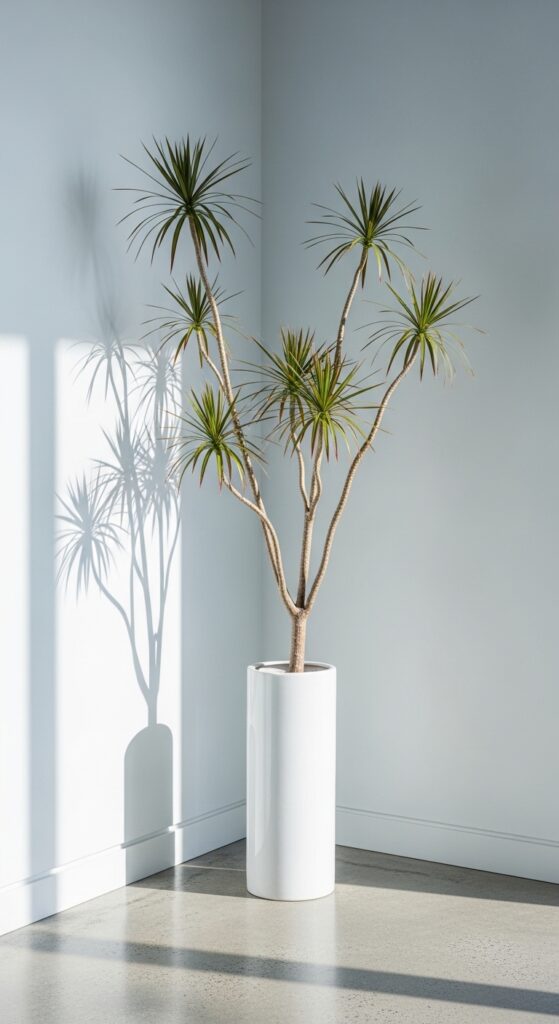The Dragon Tree has a thin, architectural trunk and spiky leaves. In a white tall-tapered pot, it looks like something out of a high-end furniture magazine. It adds height without adding “bulk,” which is a key trick in minimalist design. It’s great for placing behind a sofa to add a layer of depth to the room.