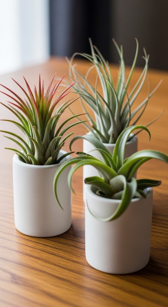 For the ultra-minimalist who doesn’t even want soil, Air Plants are the answer. You can place them in small white ceramic “pinched” bowls or hang them in white geometric frames. They are tiny, fascinatng, and look like living art. They are perfect for a minimalist desk setup or a small wall niche where a traditional pot wouldn’t fit.