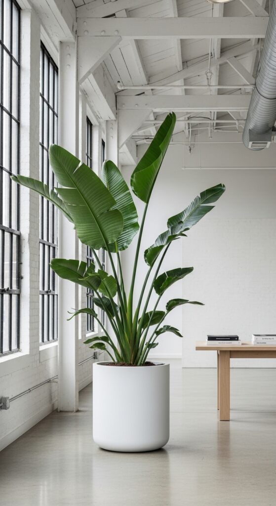 If you have high ceilings and a large living room, the Bird of Paradise is your best friend. Its massive, banana-like leaves need a sturdy, oversized white cylinder planter. It brings a “luxury hotel” vibe to your home. Even though the plant is large, the simplicity of the white pot keeps it from feeling cluttered. It’s a bold move that pays off in style points.