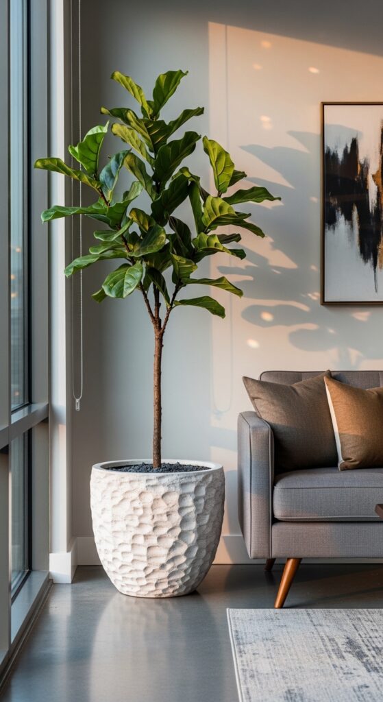The Fiddle Leaf Fig is the “it” plant of the decade. To keep it minimalist, you must use a very large, simple white floor pot. Its giant, violin-shaped leaves are the star of the show. Because the plant can grow quite tall, the white planter helps ground the look so it doesn’t feel top-heavy. It’s the perfect companion for a mid-century modern armchair.