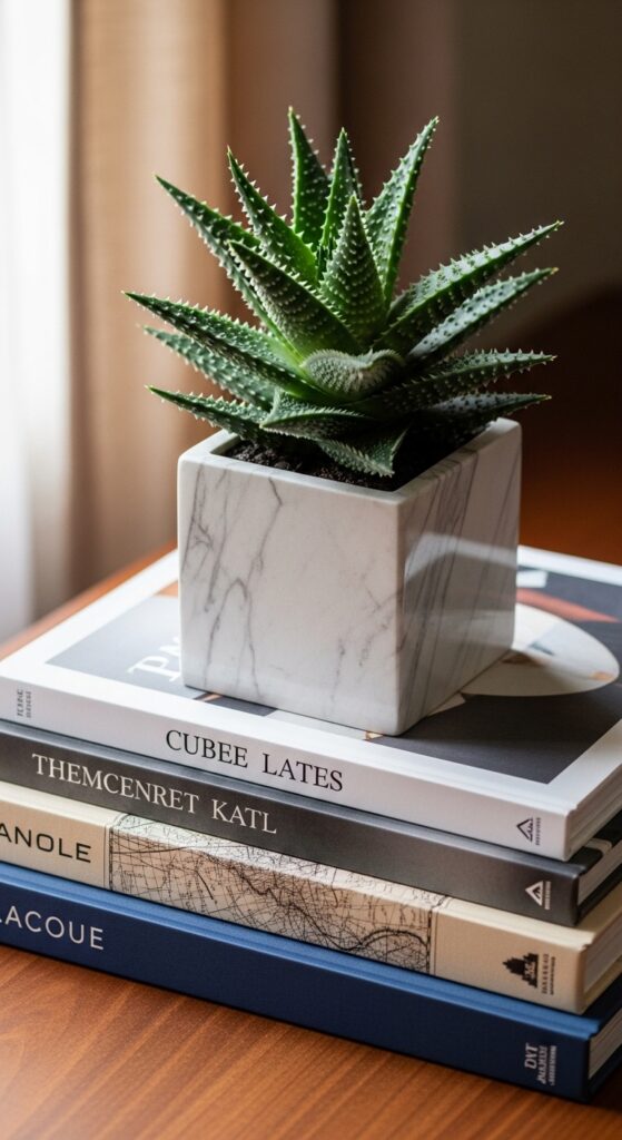 Aloe isn’t just for healing burns; its thick, fleshy leaves have a fantastic geometric shape. A small Aloe in a square white succulent pot is perfect for a coffee table centerpiece. It’s low-profile, meaning it won’t block the view of people sitting across from each other, but it adds that necessary “pop” of life to a stack of design books.