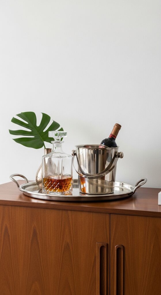 If you don’t want to buy new furniture, simply dedicate a corner of your existing sideboard or credenza. A large, decorative tray “corrals” the bottles so they look like a deliberate collection rather than clutter. Add a small vase with a single green leaf for a fresh, Pinterest-worthy touch.