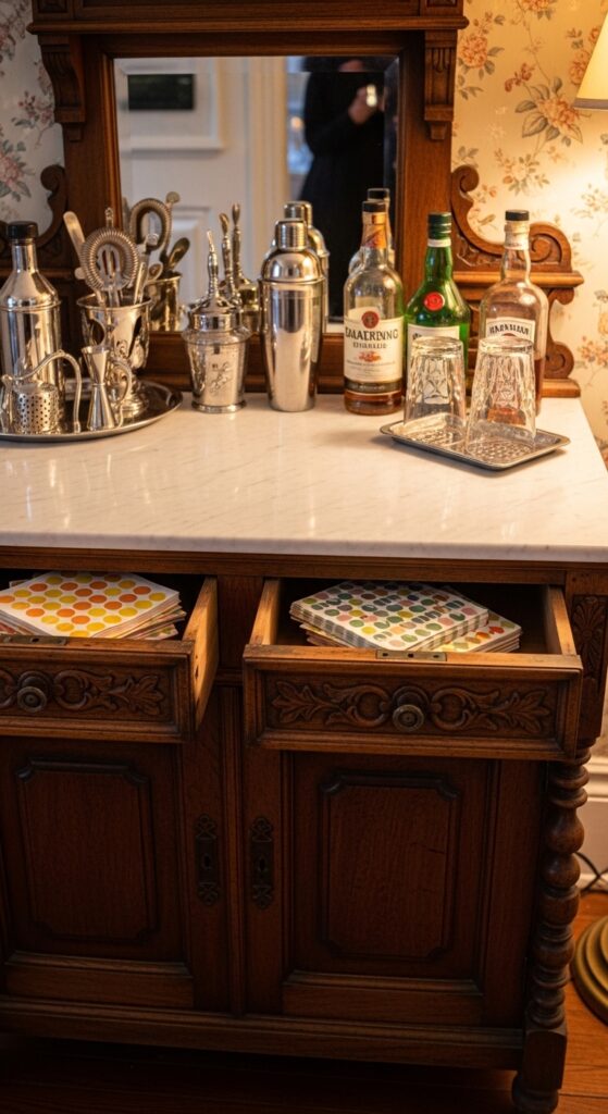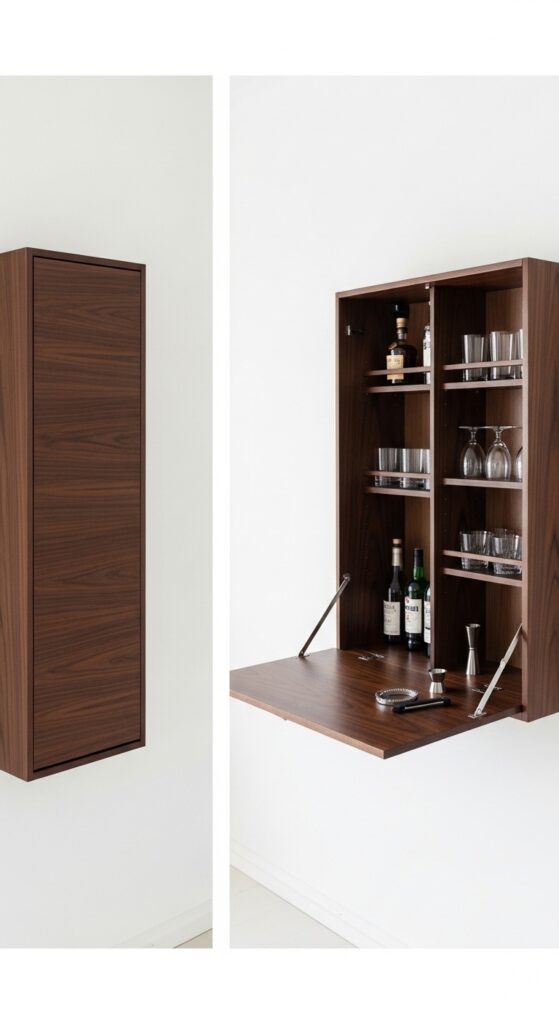 When floor space is zero, go vertical. A wall-mounted cabinet with a front flap that drops down to become a table is a genius space-saver. It keeps your bottles hidden and dust-free when not in use. When it’s “five o’clock somewhere,” simply flip it down, and you have an instant mixing station that doesn’t obstruct foot traffic.