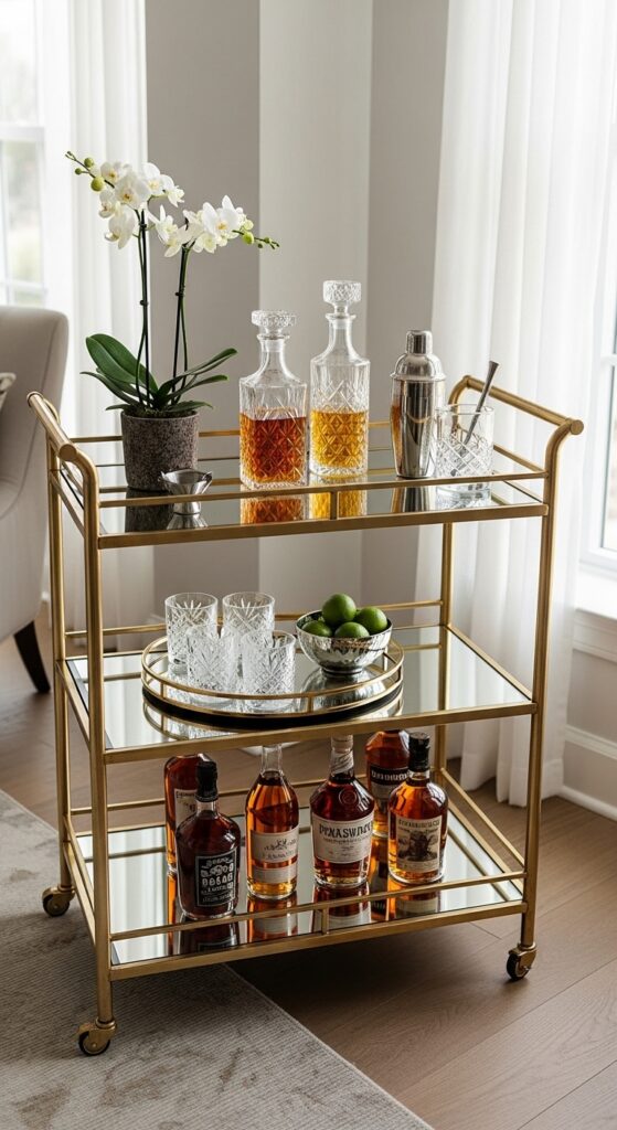 A rolling bar cart is the ultimate solution for flexibility. Choose a gold or chrome finish with mirrored shelves to reflect light, making your small corner feel twice as large. Because it’s on wheels, you can move the party from the living room to the dining area effortlessly. Style it with a few high-quality crystal decanters and a single gold shaker for a high-end look that pops on Pinterest.