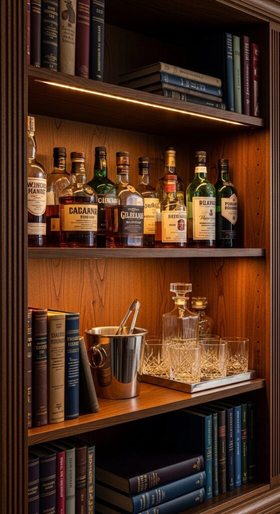 If you have a narrow bookshelf, clear out the middle two shelves to create a stationary bar. This is one of the most practical tiny bar ideas for cozy spaces because it blends seamlessly with your existing decor. Use the top shelf for tall bottles and the lower shelf for glassware. For a touch of sophistication, consider 17 brilliant bookshelf styling ideas to mix your spirits with vintage literature.