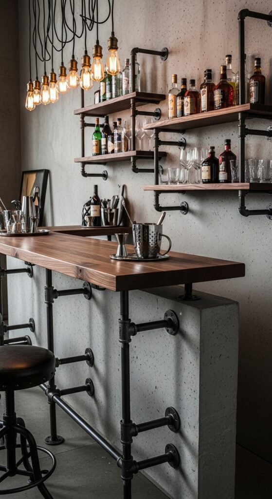 For a masculine or modern vibe, use black iron pipes and reclaimed wood to build a custom wall bar. This DIY approach allows you to fit the bar perfectly into any weirdly shaped nook. It looks rugged, professional, and pairs beautifully with leather bar accessories.