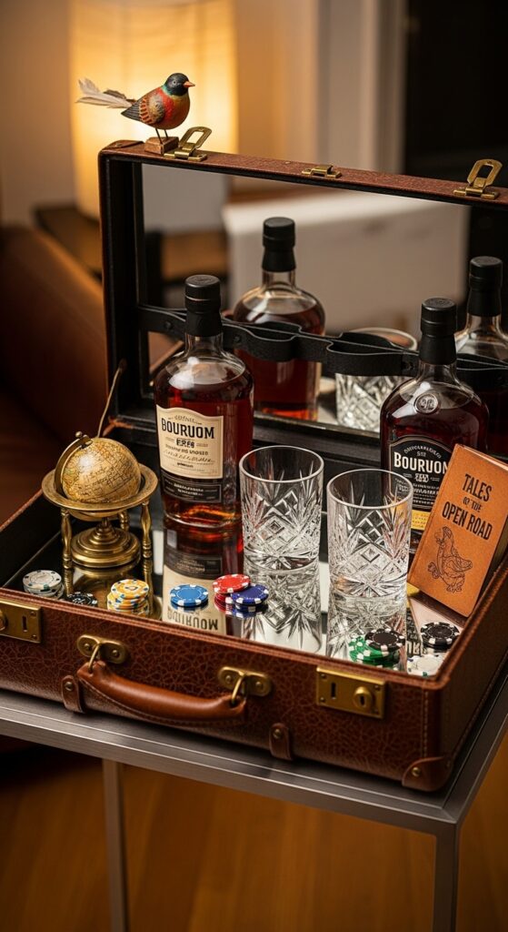 Find a vintage hard-shell suitcase, prop it open on a luggage stand, and line the bottom with a mirrored tray. This is a whimsical, conversation-starting DIY project. It’s perfect for a guest room or a corner of a home office, adding a “traveler’s lounge” vibe that is extremely photogenic.