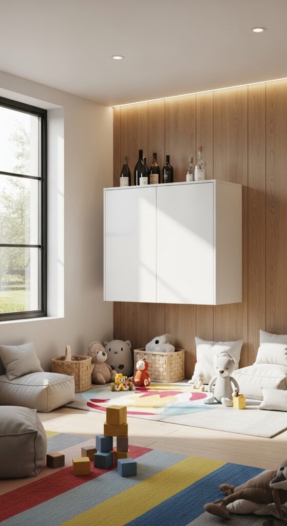 Who says the kids get all the fun? If you have a family space, a small, high-up cabinet can keep “adult drinks” safe while blending into the room’s design. You can use some of these IKEA kids playroom ideas to find budget-friendly storage that can be easily repurposed for a stylish mini-bar.