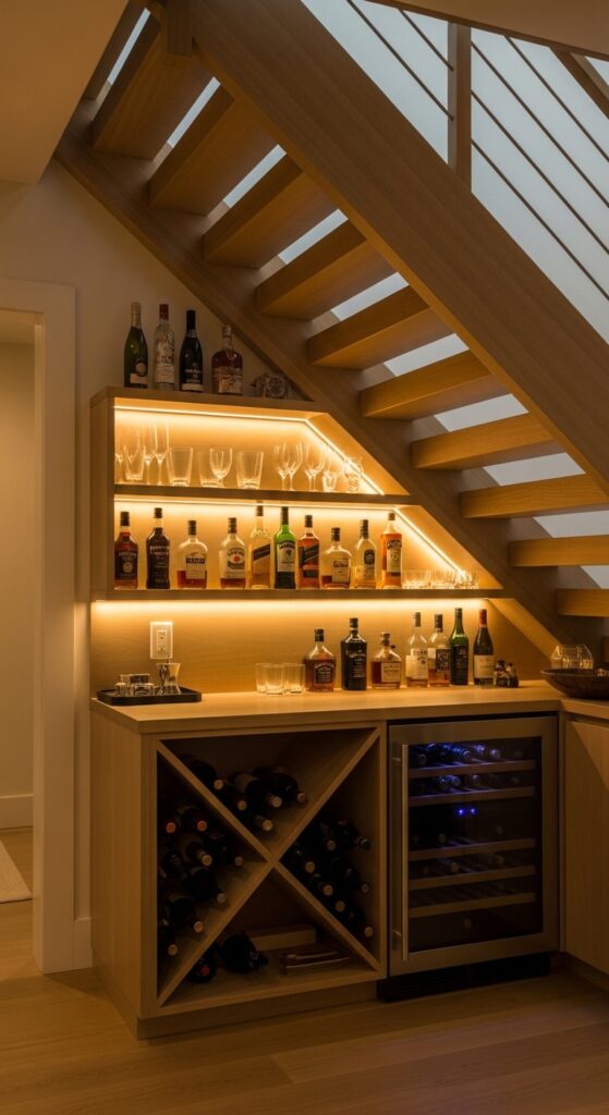 That awkward triangular space under your staircase is a goldmine for a tiny bar. Use custom cabinetry or a small sideboard that fits the slope. Add some warm LED strip lighting inside to illuminate your collection. It turns a “dead zone” into the most talked-about feature of your home.