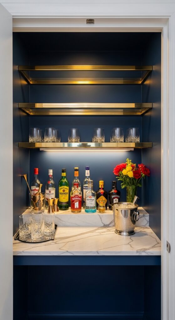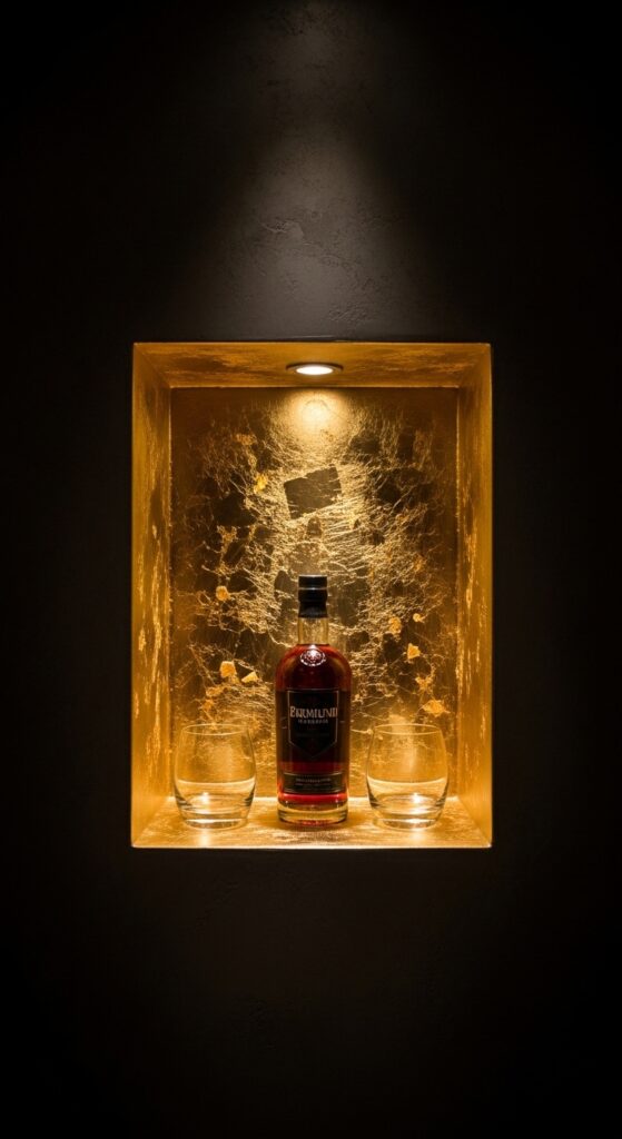 If you have a small recessed niche in your wall, line the back with gold leaf or metallic wallpaper. Even a few bottles placed here will glow under a small spotlight, creating a dramatic focal point that requires zero floor space.