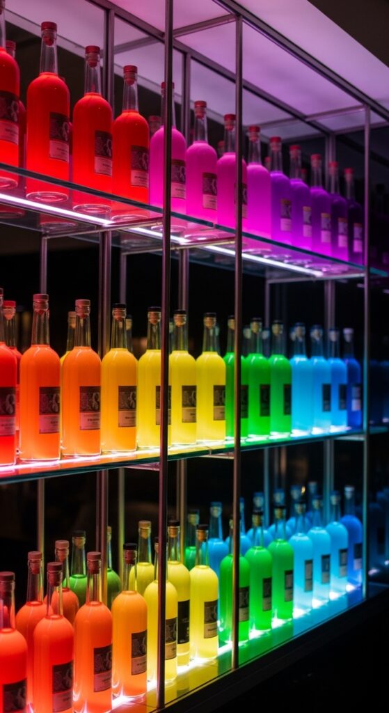 Organize your bar by the color of the liquid or the labels. This simple styling trick makes a small collection look like a work of art. Use clear glass shelves to keep the focus on the colors. It’s a fun, vibrant way to brighten up a dark corner.