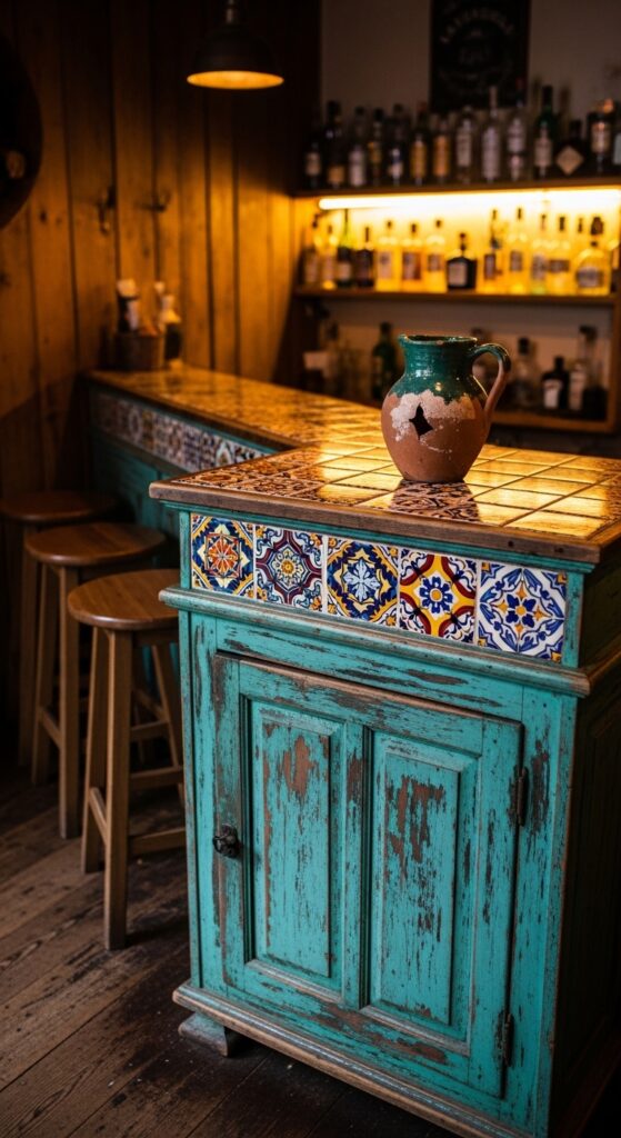 Embrace a warm, soulful vibe by using a small distressed wood cabinet. This look relies on rich textures and earthy tones. Imagine a chunky wooden surface topped with colorful talavera coasters and a clay pitcher. For more inspiration on this specific aesthetic, check out these cozy old Mexican home decor ideas to bring that rustic charm to your bar setup.
