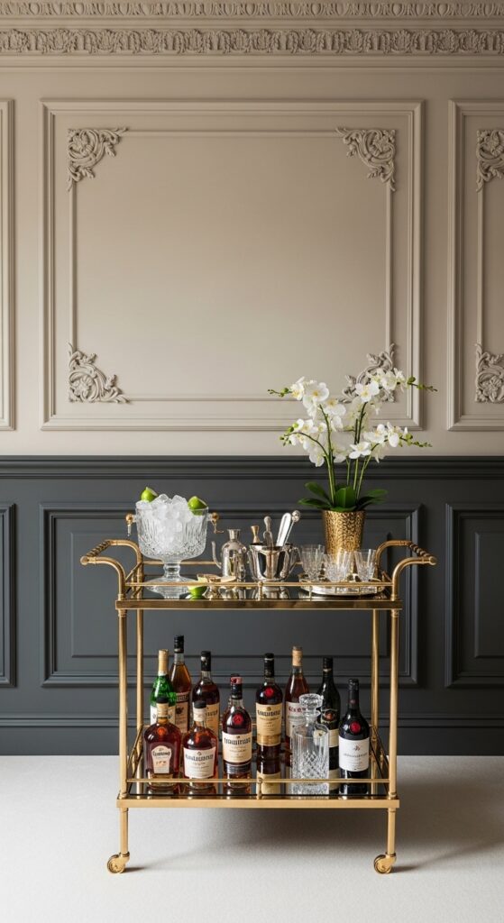 Elevate a simple bar cart by placing it against a wall with elegant trim. Adding wall molding ideas creates a “frame” for your bar, making a cheap piece of furniture look like a high-end built-in. It adds a layer of architectural depth that screams luxury.