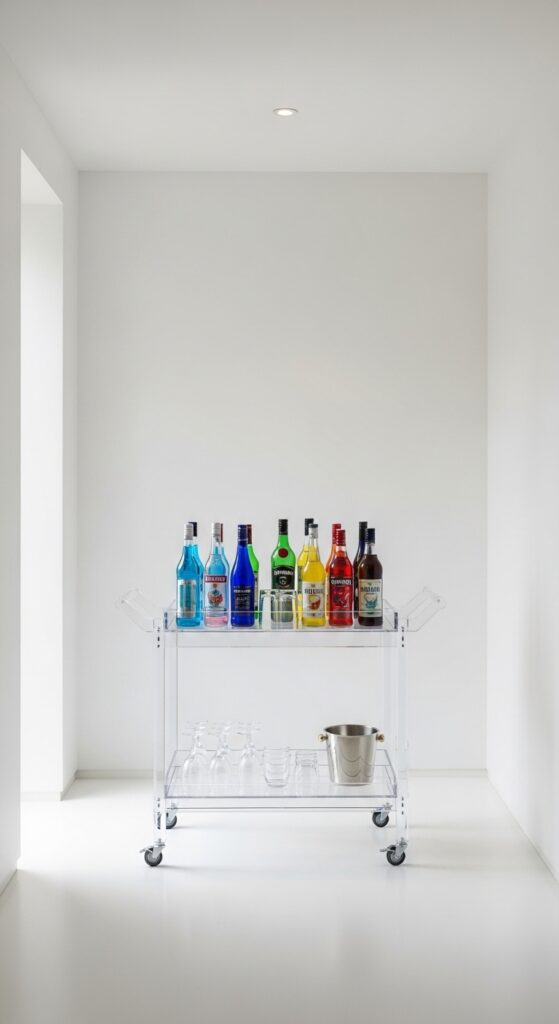Acrylic furniture is a lifesaver for cozy spaces because it’s transparent. An acrylic bar cart “disappears” into the room, holding your items without adding visual weight. It’s the perfect choice for ultra-modern or very small apartments.