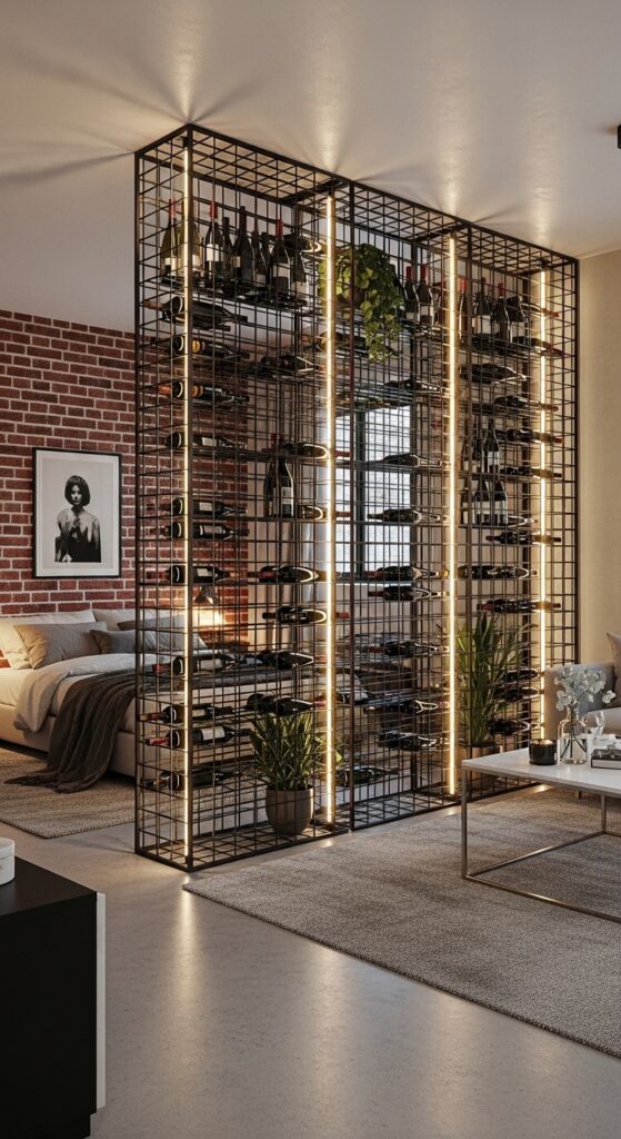 Use a floor-to-ceiling wine rack made of thin wire or wood. This acts as a room divider while storing dozens of bottles in just a few inches of horizontal space. It’s a bold, graphic look that works exceptionally well in modern, open-concept studios.