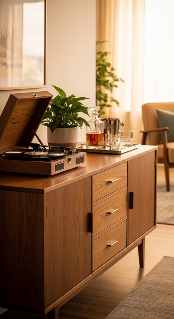 A low-profile MCM sideboard offers plenty of surface area for a tray and a decorative lamp, with deep cabinets below for the less attractive backup bottles. The tapered legs create an “open” look under the furniture, which helps a small room feel less crowded.