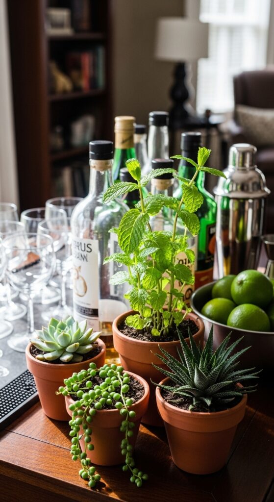 Incorporate small potted plants like succulents or herbs (like mint for mojitos!) directly into your bar setup. The greenery adds life and a fresh scent to the area, making the tiny bar feel like a natural extension of your home’s decor.
