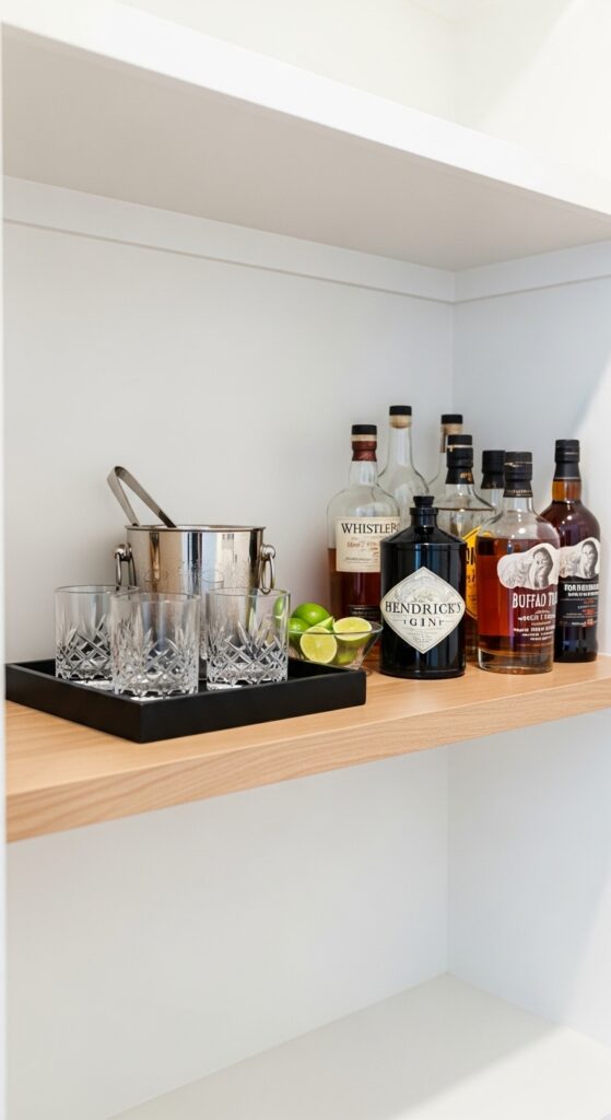If you have a kitchen pantry, carve out one shelf at eye level for your bar. This keeps the main kitchen counters clear of clutter. When guests come over, you can simply leave the pantry door open to reveal a hidden “speakeasy” vibe.