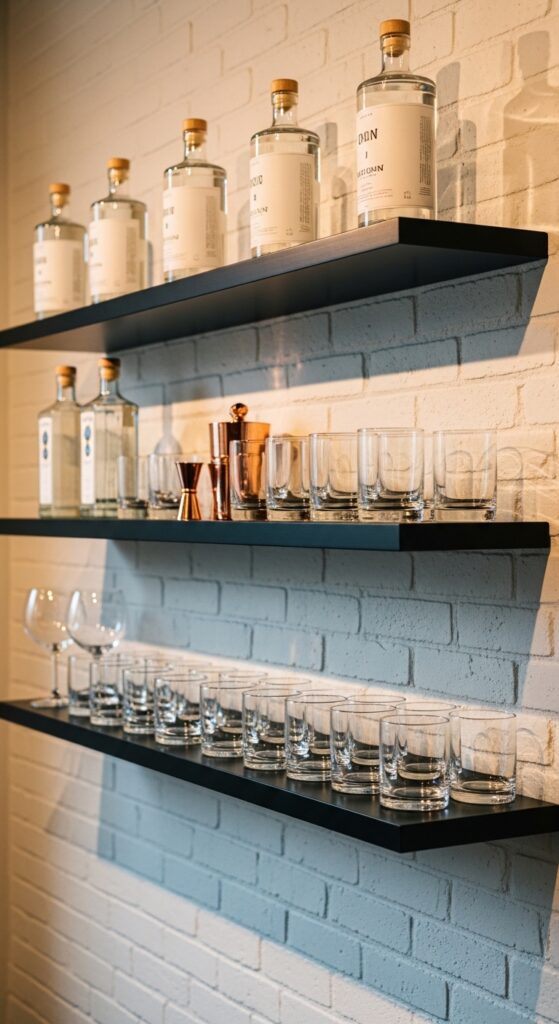 Two or three thick floating shelves can transform a bare wall into a sleek bar. Install the bottom shelf at waist height to act as the “counter” and the higher shelves for glass storage. This keeps the floor clear, maintaining an airy feel in small apartments. It’s a clean, modern look that focuses on the beauty of the bottles themselves.