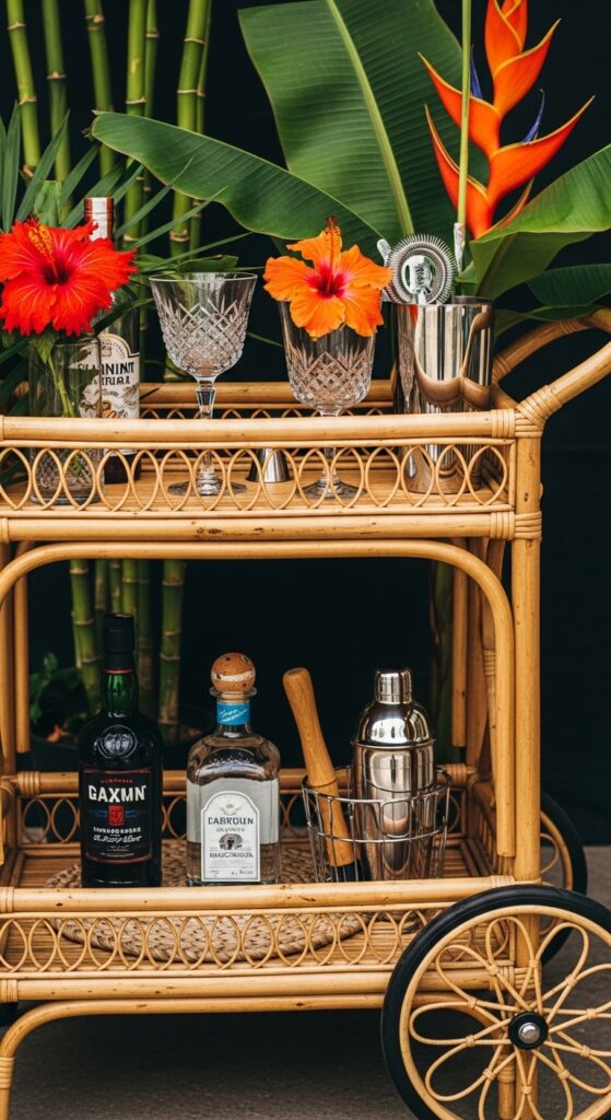 Bring a vacation vibe home with a small bamboo or rattan cart. This texture adds a relaxed, breezy feel to a sunroom or a bright corner. Pair it with colorful glassware and a small bowl of citrus fruits for an instant mood booster.