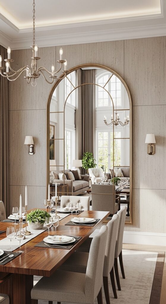 If your living/dining combo feels a bit tight, a “mirror wall” in the dining zone can change everything. A large, oversized arch mirror or a wall of “mirrored panels” reflects the entire living room back at you, creating the illusion that the house is twice its actual size. In Neo Deco styling, mirrors are used to bounce light and add glamour. By placing the mirror near the dining table, you create a “grand hall” atmosphere for meals while making the loungers in the living room feel like they are in a much more expansive, open sanctuary.