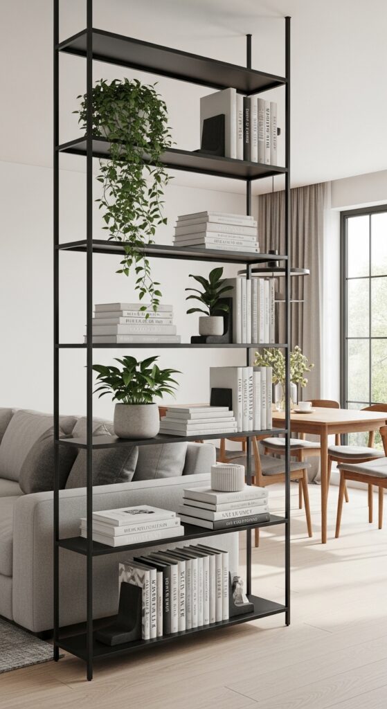 Open, double-sided shelving units are the ultimate “secret weapon” for combo rooms. By placing a tall, minimalist shelf between the living and dining zones, you create a “see-through” wall. This provides privacy and separation without blocking the natural light. You can style these shelves with Neo Deco metallic objects, trailing plants, and coffee table books. It’s a highly practical solution because it adds storage to both “rooms” simultaneously. On social media, these “shelf dividers” are viral because they offer a way to display personality while performing a major architectural function in a small home.