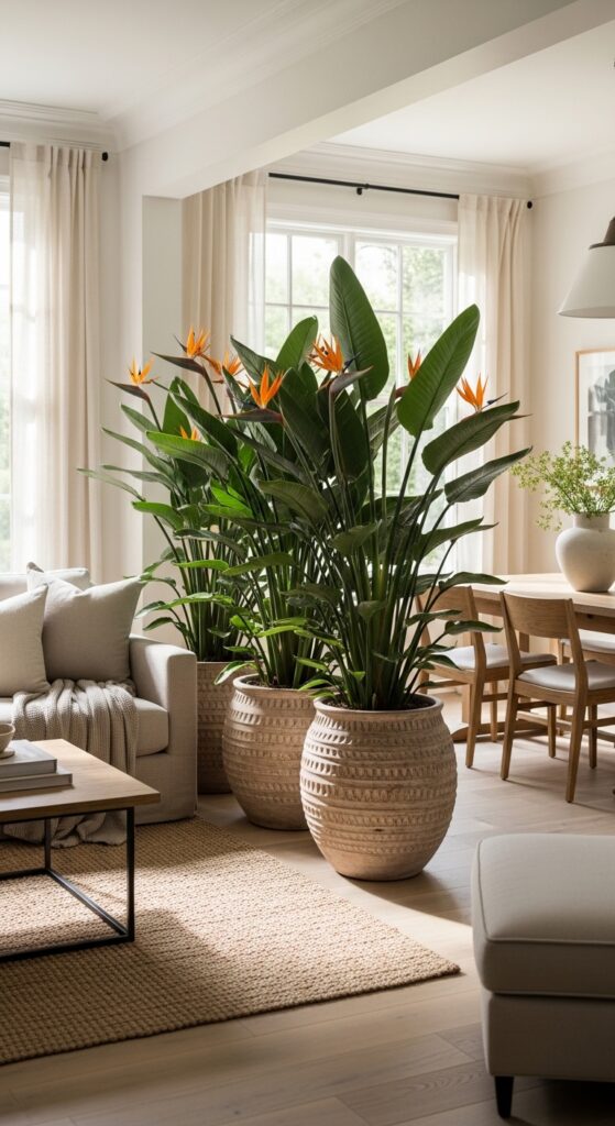 If you prefer an organic look, use tall, leafy plants to create a natural “room divider.” A row of three large planters featuring “Bird of Paradise” or “Fiddle Leaf Fig” plants can act as a soft, living screen between the sofa and the dining chairs. This biophilic design approach is a 2026 staple because it adds life and oxygen to the room while providing a visual “pause.” The vibrant green of the plants complements almost any Neo Deco or Boho color scheme, making the transition between lounging and eating feel peaceful and connected to nature.