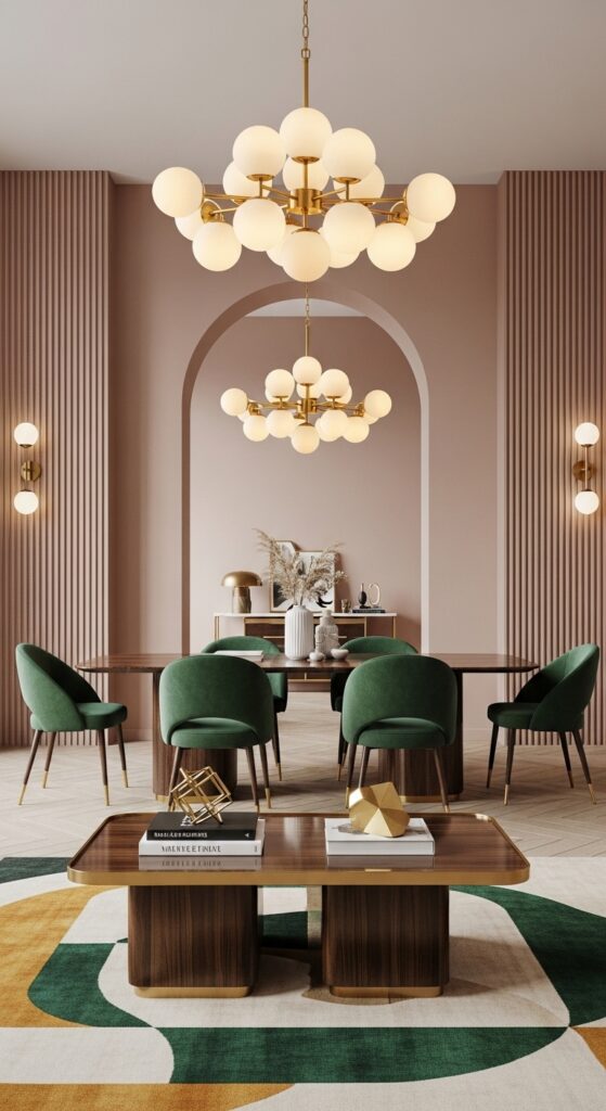Lighting is the “jewelry” of a combo room, and you need a “pair” to make it work. Instead of one central light, hang two distinct statement fixtures—one over the coffee table and a larger, lower-hanging one over the dining table. For a Neo Deco vibe, use polished brass chandeliers with globe bulbs. By keeping the materials the same (e.g., both brass), you unify the space, but by varying the heights, you define the purpose of each zone. This creates a “vertical anchor” that makes the ceilings feel higher and the overall layout feel much more expensive and custom-built.