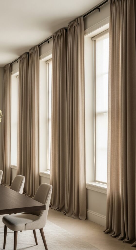 To make a combo room look like a single, grand hall, use identical window treatments across the entire wall. If you have one long wall with multiple windows, hang a single, continuous curtain rod and use floor-to-ceiling drapes in a neutral linen or a soft velvet. This “washes” the wall in texture and removes the visual “breaks” between the living and dining areas. It makes the space feel twice as wide and significantly more luxurious. It’s a classic hotel-lobby trick that translates perfectly to home decor, giving your open-concept living space a polished, “finished” appearance.